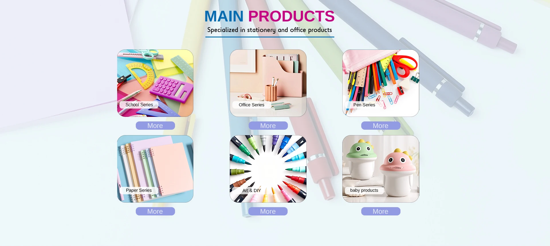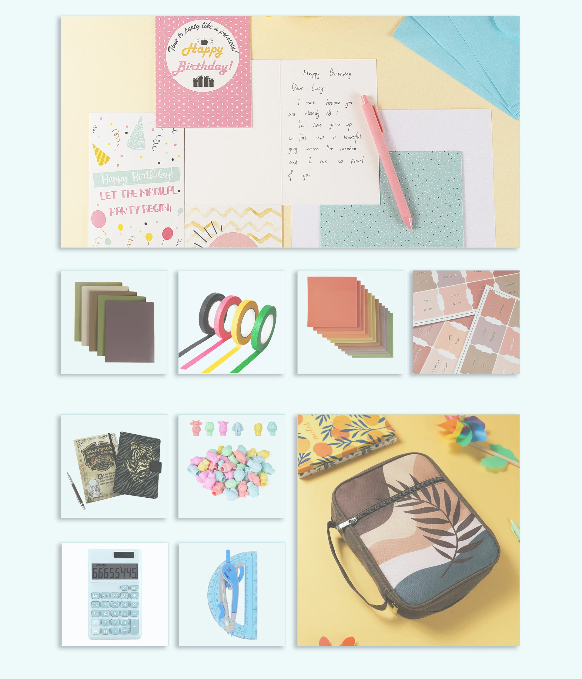 Prodotti principali: Calcolatrice, penna, evidenziatore, nota adesiva, temperino